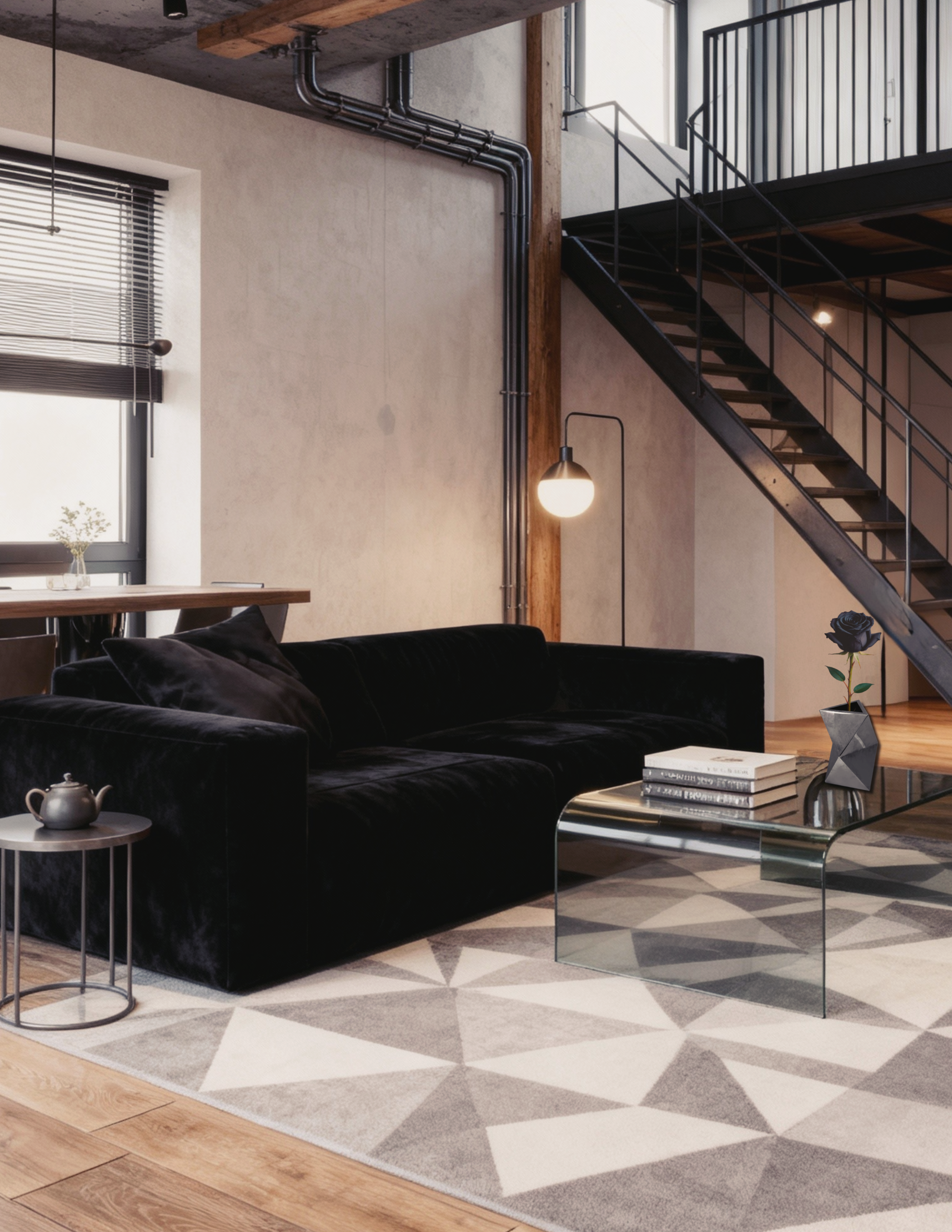 With exposed structures and a palette of neutrals, this loft embraces industrial design at its finest. The metal vase becomes the focal point — a fusion of craftsmanship and modern art that anchors the space with understated sophistication.